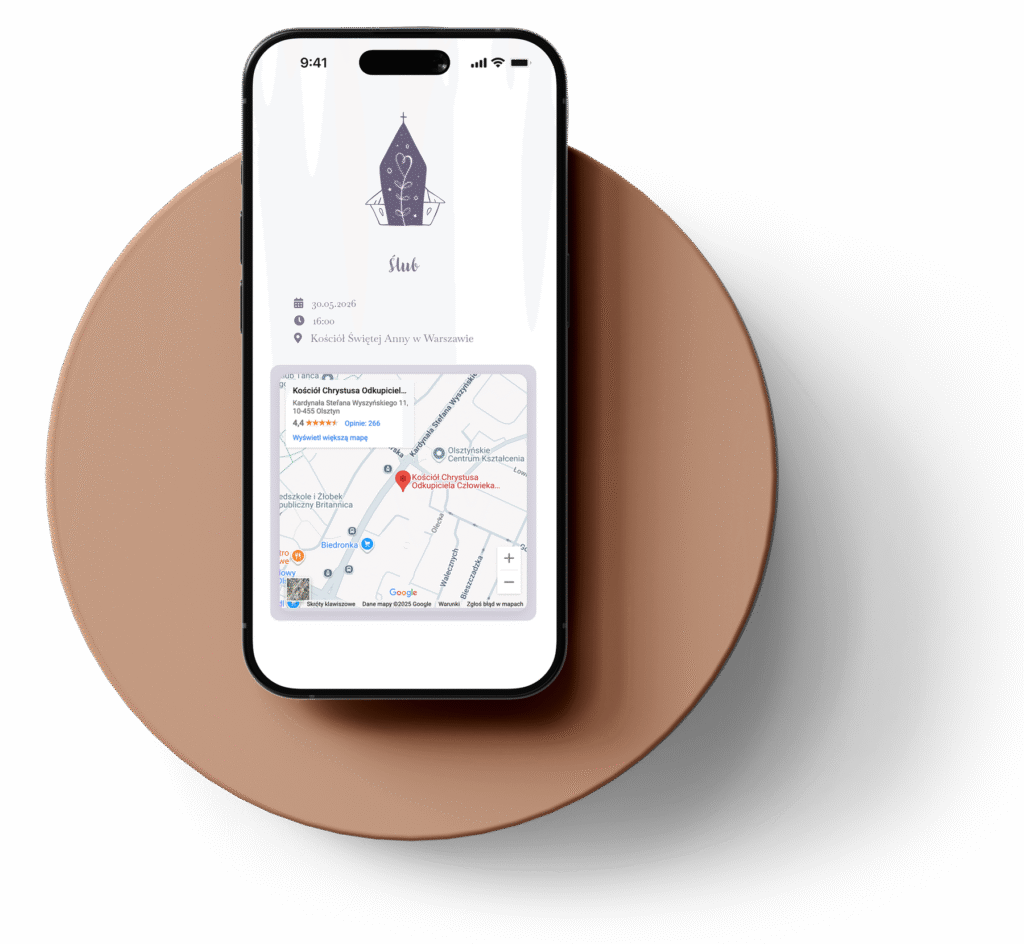 Czy to kościół w centrum miasta, czy sala wśród pól – Twoi goście bez problemu trafią na miejsce dzięki wbudowanej mapie z lokalizacją.