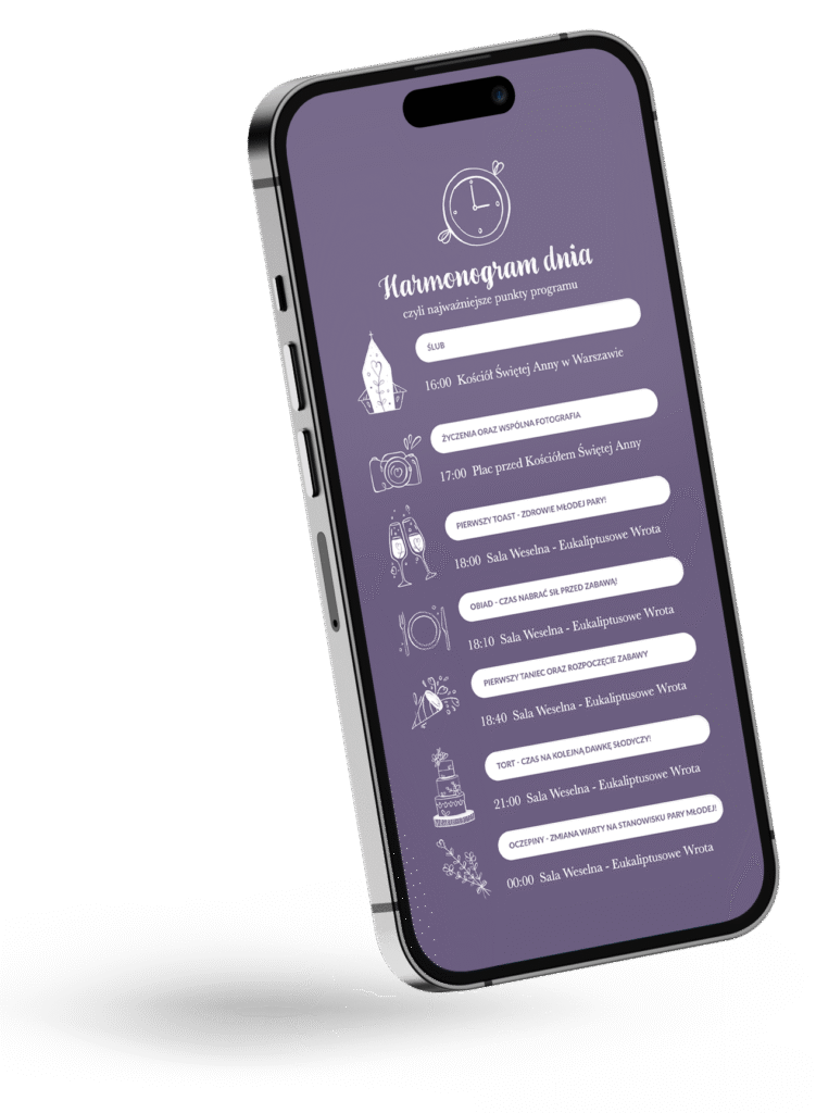 Kiedy ceremonia? Kiedy obiad? A kiedy tańce? Goście będą dokładnie wiedzieli, co i kiedy się dzieje.